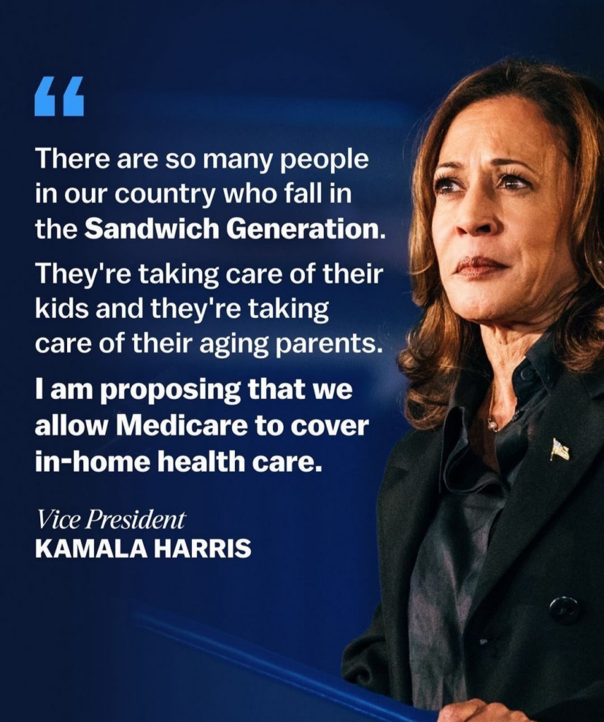 Vice President Kamala Harris on the Sandwich Generation : “There are so many people in our country who fall in the Sandwich Generation. They’re taking care of their kids and they’re taking care of their ageing parents. I am proposing that we allow Medicare to cover