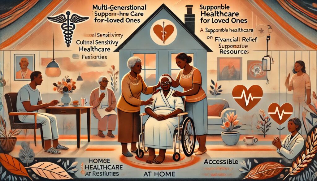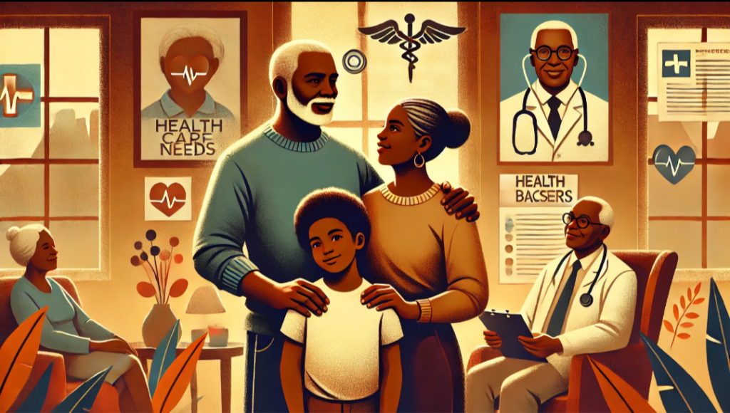illustration representing multigenerational support within Black families, highlighting resilience and unity amidst challenges related to health care access.