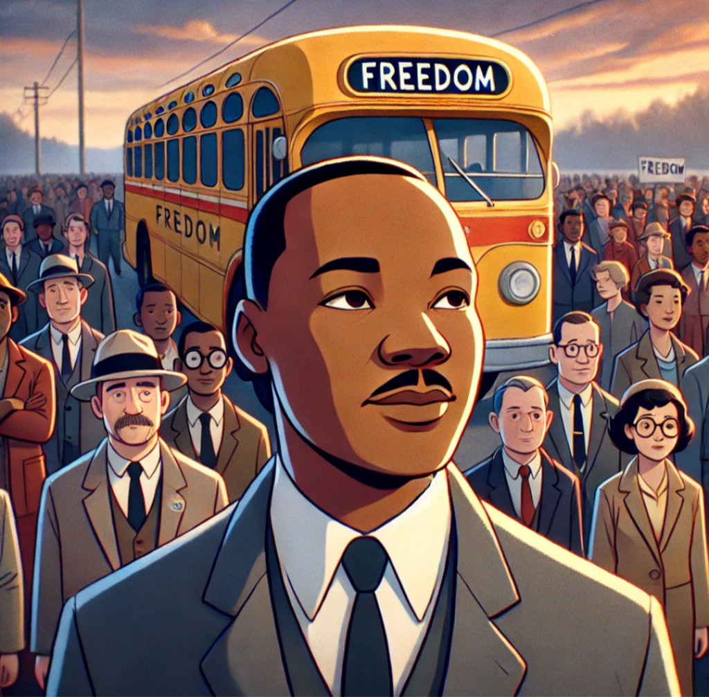 Martin Luther King Jr. leading the Montgomery Bus Boycott in 2D animation style.
